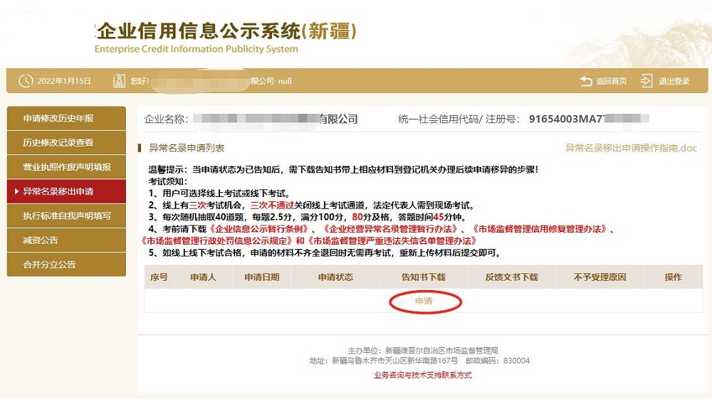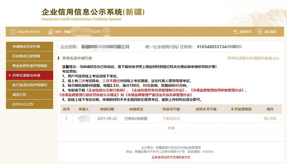 企业被列入经营异常名录的自列入之日起3年内,可以通过国家企业信用公示系统(新疆)网站,在线向工商行政管理部门申请移出经营异常名录,申请被受理后,需法定代表人(负责人)认真学习《企业信息公示暂行条例》、《企业经营异常名录管理暂行办法》、《市场监督管理信用修复管理办法》、《市场监督管理行政处罚信息公示规定》和《市场监督管理严重违法失信名单管理办法》,在登记机关指定场所参加闭卷考试,也可通过《国家企业信用公示系统》网站参加在线考试,成绩合格后方可移出经营异常名录。本网站有考试题库,可以助企业取得好成绩。