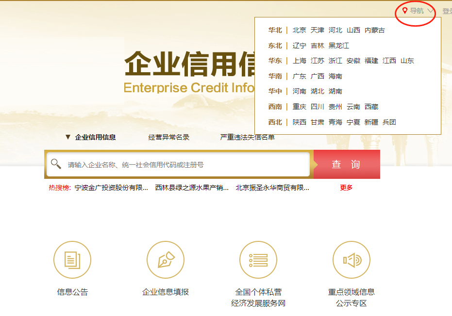 1、在国家企业信用信息公示系统的导航栏,根据公司所在省份选择省市进入本地系统: